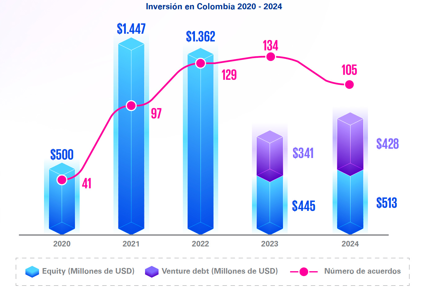 Además de las instituciones educativas, se fue fortaleciendo el ecosistema de inversión y financiamiento. La evolución ha sido evidente desde el 2020 hoy como se puede evidenciar en este gráfico extraído de Colombia Tech Report 2024.